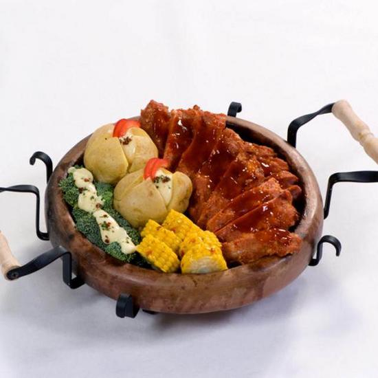 Gevuld met spareribs, mais,  broccoli en aardappelen.