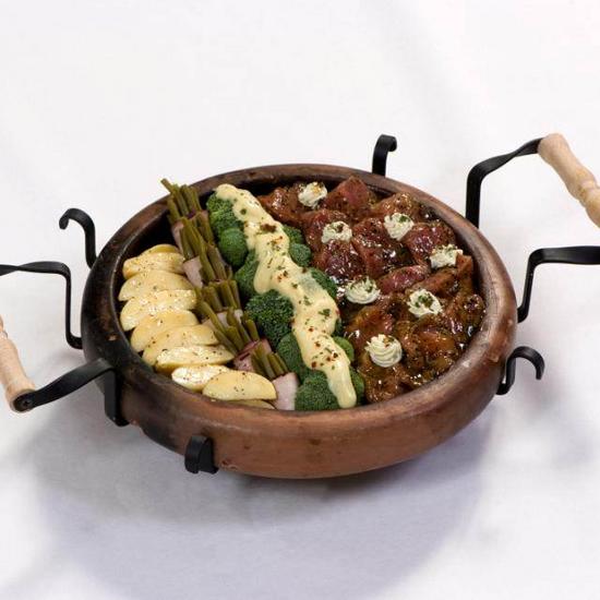Gevuld met varkenshaas, broccoli, bonen met spek en aardappelen. Borg € 20,00 voor de steen te betalen in de winkel.